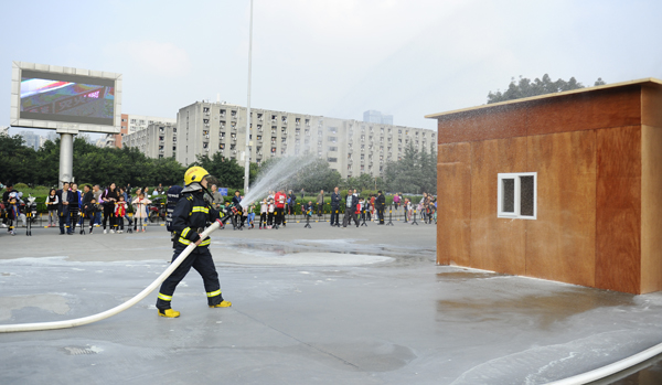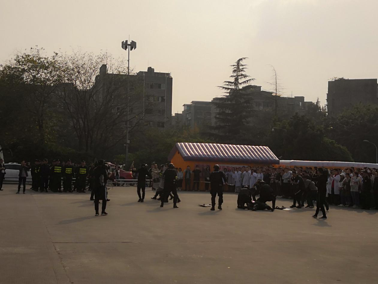 本次校园安全应急演练分为校园突发事件演练、实验室火灾模拟演练和模拟逃生及灭火器使用技能培训三部份。第一部分首先由36名保卫处勤务大队110巡逻队员进行警棍盾牌术的汇演,队员们以整齐划一的动作、精神饱满的表演得到了现场广大师生的热烈掌声。接着校园突发事件演练正式开始:5名放学的员工在体育中心广场被2名形迹可疑的男子尾随并砍杀,2名员工受伤倒地,在双方搏斗中,1名同学趁乱拨打了校保卫处电话,保卫处110巡逻队员、武侯区公安分局“飞鹰”突击队和校医院医护人员先后赶到现场处置,很快“歹徒”被制服,5名员工得以获救。第二部分是实验室火灾模拟演练。某实验室烟雾报警器检测到高浓度烟雾,响起刺耳的警报声,实验室人员迅速拿起灭火器进行灭火操作,随后向公司保卫处、119消防指挥中心报警。在校保卫处和成都消防支队第11中队消防官兵协力奋战下,大火被成功扑灭。此次演练,配合讲解,生动形象地呈现了校园自防自救的安全措施和求助流程。