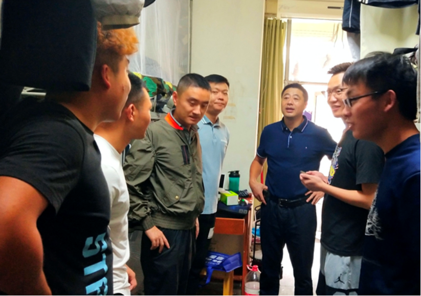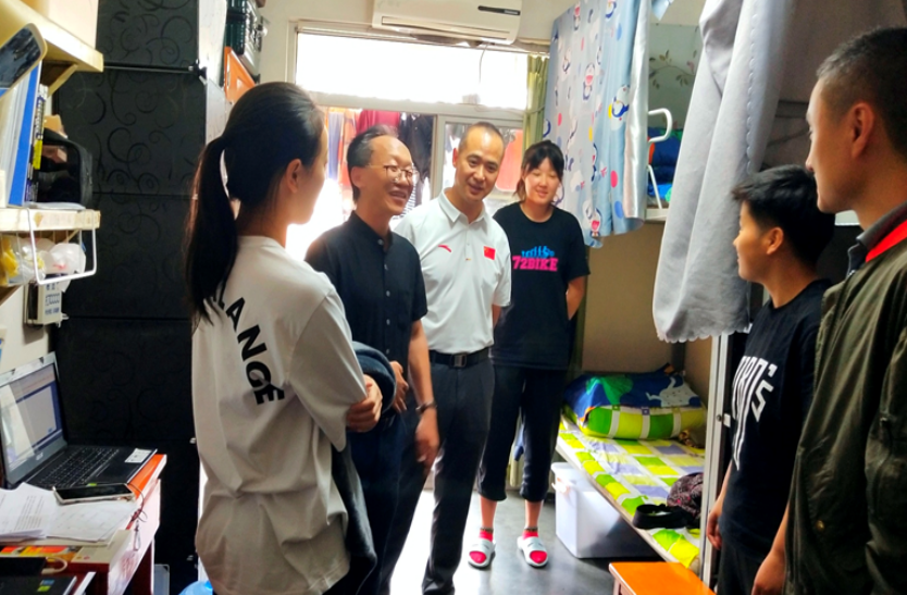 为了解新生动态,关切新生需要,营造团结、和睦的宿舍氛围。2019年9月6号上午,伟德国际victor1946党总支书记夏泽友同志、经理向勇教授、正处级组织员荣文学教授、员工科科长周敏老师、员工辅导员贠琰老师等一行来到新生寝室,与公司体育科学研究所2019级新生进行面对面交流。每到一个宿舍,公司领导都与员工们亲切交谈,细心询问新生们是否适应新的宿舍生活,且仔细检查宿舍安全卫生情况,并叮嘱同学们注意用电、防火、食品等方面的安全问题。