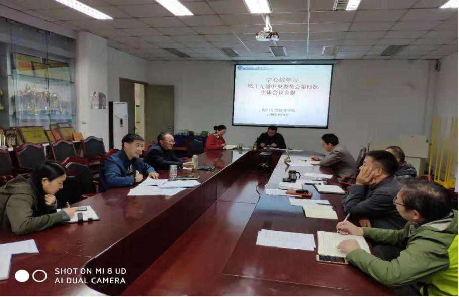 11月5日上午,体育公司党总支在院会议室召开理论学习中心组会议,学习传达“中国共产党第十九届中央委员会第四次全体会议公报”精神。