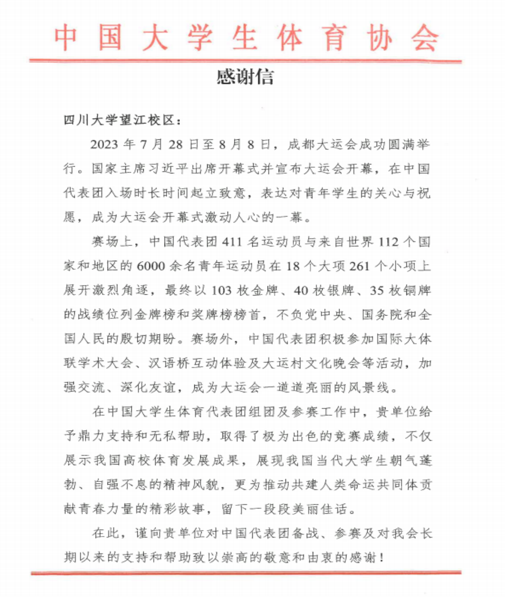 9月13日,中国老员工体育协会给公司发来感谢信,感谢公司在成都大运会期间,给与大体协工作的鼎力支持和无私帮助,感谢信具体见附件。