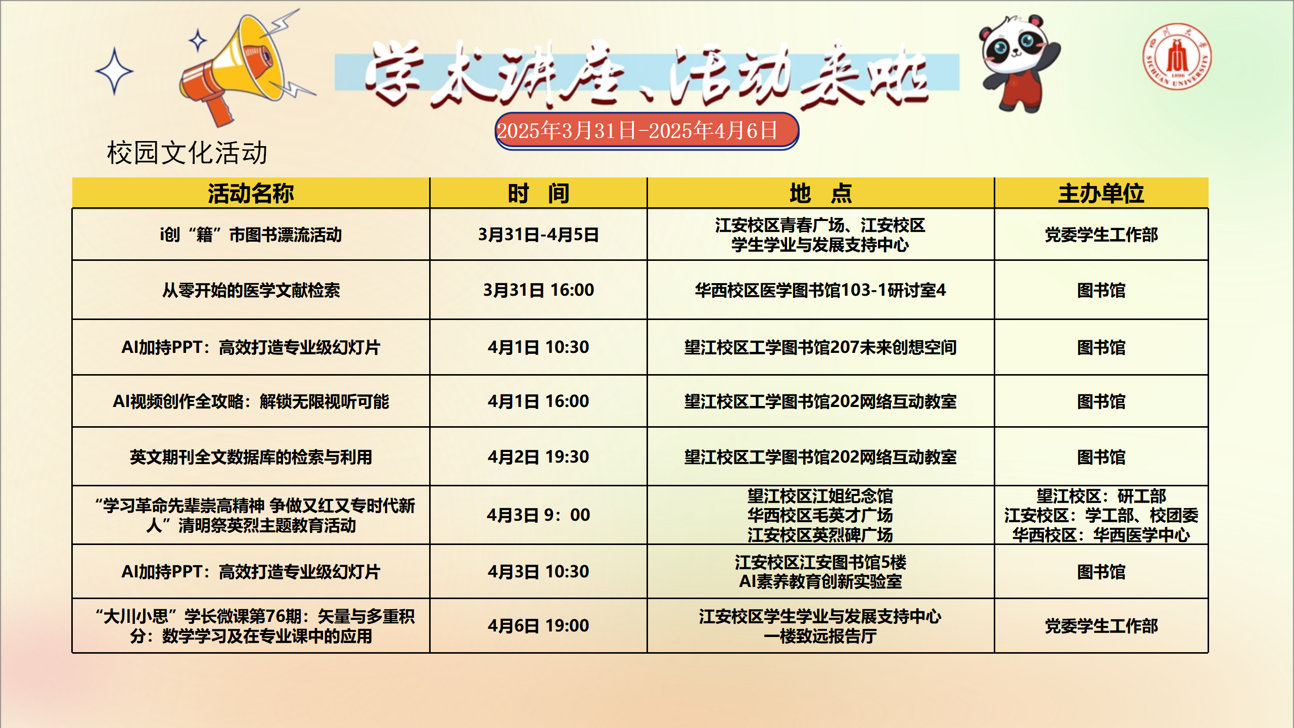学术讲座及校园活动文化预告(3月31日-4月6日)