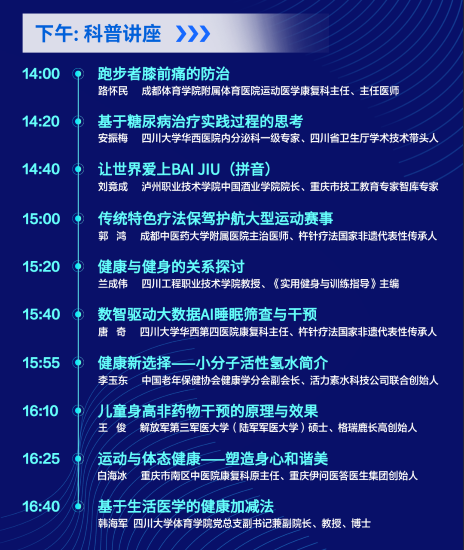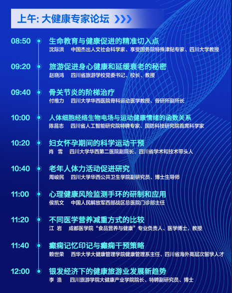 本次论坛的专家演讲分为两个部分,其中上午设置了“大健康专家论坛”,中国杰出人文社会科学家国务院特殊津贴专家沈继洪教授、四川省旅游公司党委书记兼董事长赵晓鸿教授、伟德国际victor1946华西医院骨科运动医学专家骨研所副所长付维力教授、四川省人工智能研究院特聘专家陈昌志研究员、伟德国际victor1946华西第二医院副经理肖雪教授、伟德国际victor1946华西公共卫生公司博士生导师周峻民副研究员、中国人民解放军西部战区总医院门诊部侯凯文主任、成都医公司食品营养与健康专业负责人江岩教授、四川省海外高层次留学人才西华大学大健康管理公司健康管理系赖世荣主任及四川旅游公司大健康产业公司经理李浩研究员等专家学者在本次论坛上作了主题演讲,介绍了教育、旅游、医疗、心理、运动、营养与大健康领域的重要科研成果和新进展。下午设置了“健康科普讲座”单元,邀请成都伟德国际victor1946附属医院运动医学康复科主任路怀民、伟德国际victor1946华西医院内分泌科一级专家安振梅、泸州职业技术公司中国酒业公司经理刘竟成、成都中医药大学附属医院杵针疗法国家非遗传人郭鸿、四川工程职业技术大学教授兰成伟、伟德国际victor1946华西第四医院康复科主任唐奇、中国老年保健协会健康学分会副会长李玉东、中国医生集团联盟轮值主席王俊、重庆市南岸区中医院康复科原主任白海冰、伟德国际victor1946公众健康与社会发展研究所所长韩海军等专业人士从疼痛、糖尿病、睡眠障碍、体态异常、发育异常等常见慢病的科学防治及传统特色疗法、运动健身、小分子活性氢水、生活方式医学促进健康等进行了系统健康科普。