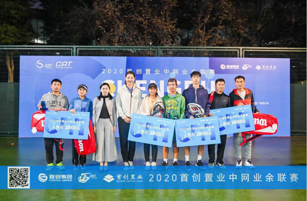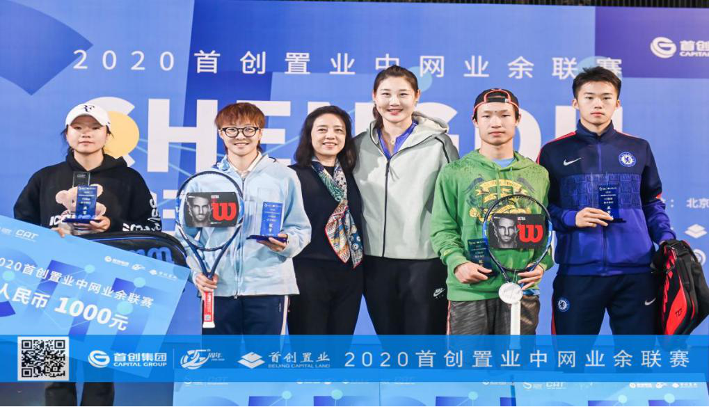 王心怡(左3)、崔舜武(左4)2020首创置业中网业余联赛3.0级别混合双打冠军